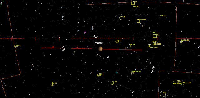 | Trayectoria de Marte con movimiento directo entre las estrellas de SAGITARIO a lo largo de octubre 2016 |